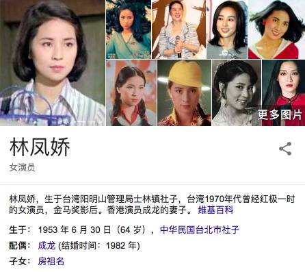 在图 1 中,当用户输入“jackie chan”,搜索引擎可以识别出 jackie chan 其实就是成龙,而且,会给出成龙的各种属性信息,比如说出生日期、国籍、配偶等。这些都是以前基于关键词的检索做不到的,有了知识图谱以后,就可以即问即答了。点击成龙的配偶“林凤娇”,可以直接进入她的知识卡片,见图 2: