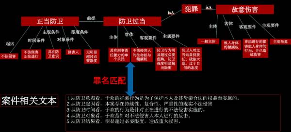 从上面这个例子可以看出,每一个犯罪行为都有主体、客体、主观要件和客观要件,我们就需要从文本中去抽取这些信息,从而形成一个关于犯罪行为的图谱,而通过对海量判决书的挖掘,可以建立犯罪行为之间的关联,比如说,防卫过当和故意伤害之间有一个关联,即误判为的关系。通过这个图谱,给定一个判决书,可以辅助法官判的一个案件是否有误判,是否需要补充信息。