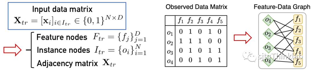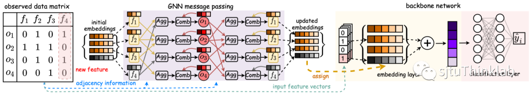 事实上,当我们利用输入数据将样本与特征表示在一张图上后,通过图结构我们就能得到样本-特征以及特征-特征之间的关系。这里特征-特征的关系由样本作为中间节点,也就是图上的二阶相邻信息给出。基于此,图的建立为我们提供了天然的已观测特征与未观测特征的联系。当模型完成训练后,我们可以得到已观测特征的表示embedding,而后对于在测试阶段引入的新特征,我们就可以利用图结构做信息传递,把已观测特征的embedding信息通过图神经网络计算新特征的embedding,从而实现特征的外推。