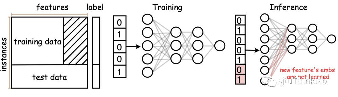 目前的大多数机器学习任务,通常假设训练数据与测试数据共享一个特征空间。然而在实际场景中,训练好的模型通常需要与一个开放环境进行交互,测试集中就会出现新的特征。例如推荐系统中利用用户的年龄、职业等特征训练好了一个推荐模型,后来公司新发布了某个应用,收集到了新的用户数据,这就需要用新的用户特征进行决策。