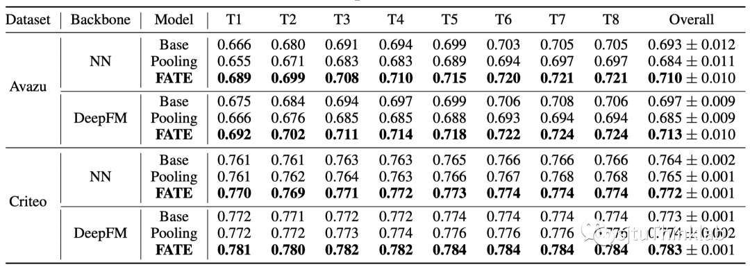 此外,我们还在大规模广告数据集(百万级样本和特征)开展了实验。这里我们采用动态时间划分:将所有样本按时间先后排序,再分为10份,取第一份为训练数据,第二份作为验证集,第三到第十份作为测试集。这样的划分方式天然的在测试集中引入了训练集中未出现的新特征,新旧特征的比例接近1:1。我们分别以DNN和DeepFM作为backbone模型,使用ROC-AUC作为评测指标,结果如下。我们的方法能够取得最优的预测性能。