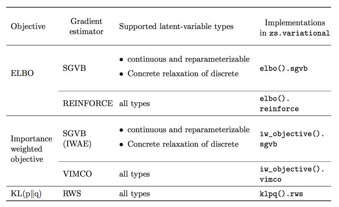 表 1. 珠算的变分推断。相关参考文献是 SGVB(Kingma & Welling,2013),REINFORCE(Williams,1992,Mnih & Gregor,2014),IWAE(Burda 等人,2015),VIMCO(Mnih & Rezende,2016)以及 RWS(Bornschein & Bengio,2014)