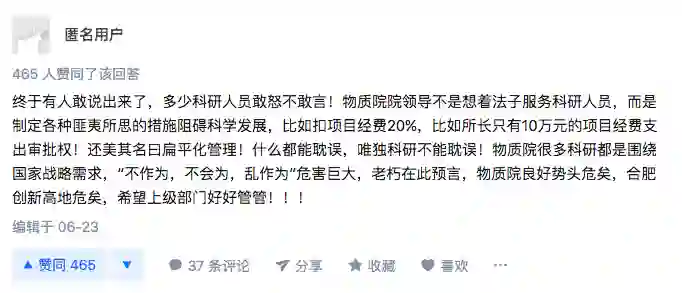 6月份甚至有所内人员提出,研究院推行了改革,对待科研人员更加严苛了。比如扣项目经费20%,比如所长只有10万元的项目经费支出审批权。