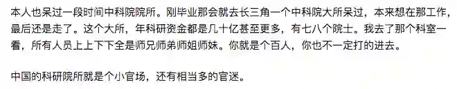 另外,也有业内人士指出,近年来科研圈越来越「官僚化」了,研究所尽管嘴上说着「什么都能耽误,唯独科研不能耽误。」,而现实的科研人际关系网却越来越复杂。