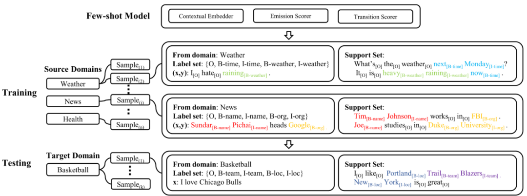 少样本序列标注任务面临着不同于其他纯粹的分类任务的独特挑战,因为序列标注是一个结构化预测问题,有建模标签间的依赖关系的需求。然而,不同领域通常具有不同的标签集,这使得难以跨领域地学习标签依赖性——无法利用过往经验。