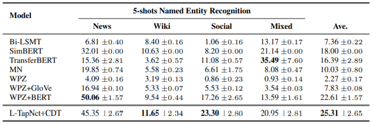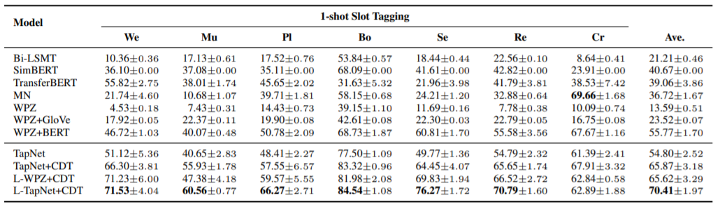 最终,我们提出了一种基于CRF的少样本序列标记框架,以整合上面提到跨领域标签依赖建模和L-TapNet给出的标签概率(见Fig 5)。在语义槽标记(Slot Tagging)和命名实体识别(NER)数据集上的实验表明,我们的模型在1-shot设置中分别显着优于最强的少样本学习baseline 7.96和11.70 F1-score。