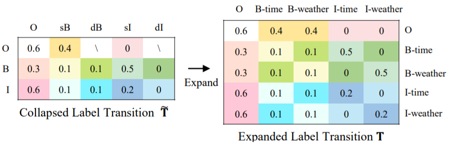 Transition Scorer 负责估计标签的转移概率。如Fig 6所示,它通过将特定领域的标签划分为几个抽象标签类别,并建模抽象标签之间依赖关系。由于我们的抽象分类标准是可以跨领域的,我们得以将抽象的标签依赖信息从源域迁移到目标域。在目标域上,我们直接将迁移的抽象标签依赖关系扩展为特定领域的具体标签之间的依赖关系。扩展过程如图所示,我们把抽象转移概率表(Collapsed LabelTransition)中的值,填到具体转移表(Expanded Label Transition)中颜色相同的位置,从而得到具体的转移概率。由于整个过程是可导的,因而我们直接端到端地在一个个具体的源领域,用反向传播的方式学习抽象转移概率。
