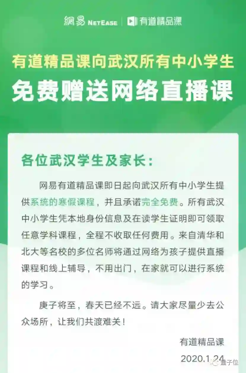 除了网易严选有专供湖北的一分钱口罩之外,网易有道为武汉中小学生免费提供寒假课程。
