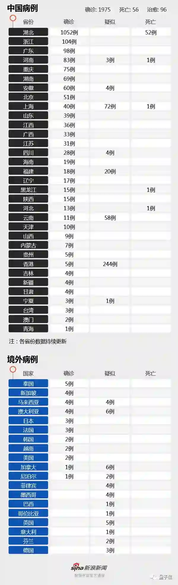 截至1月25日24时,全国确诊人数已至1975例,死亡56例,治愈96例。