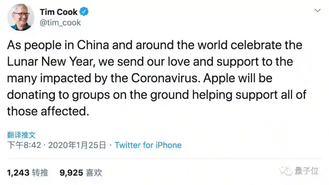 昨天晚上,库克发布了一条推文,宣布要向受疫情影响地区献爱心。