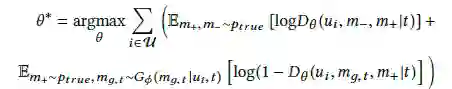生成器:(Figure1 的左边)类似于条件 GAN,我们的生成器 G 输入用户偏好数据和时刻 t,给用户 i 生成推荐列表,具体公式如下:
