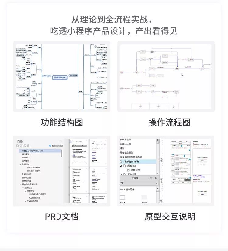 并通过全程项目实战,手把手教你独立完成商业级小程序的全流程产品设计,同时强化自己多端口产品的设计能力,提升职业竞争力。