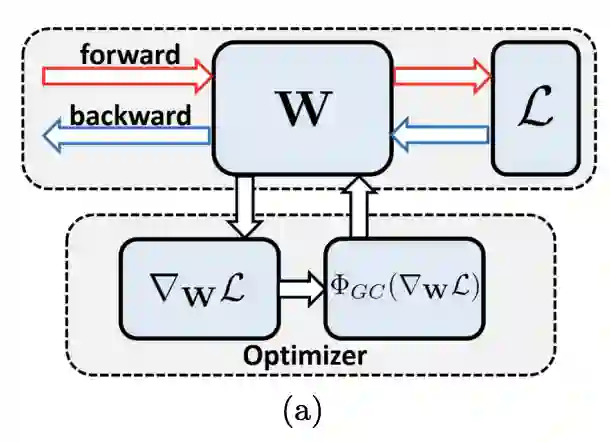 与在权值和特征值进行标准化方法不同,论文提出作用于权值梯度的高性能网络优化算法梯度中心化(GC, gradient centralization),能够加速网络训练,提高泛化能力以及兼容模型fine-tune。如图a所示,GC的思想很简单,零均值化梯度向量,能够轻松地嵌入各种优化器中。论文主要贡献如下: