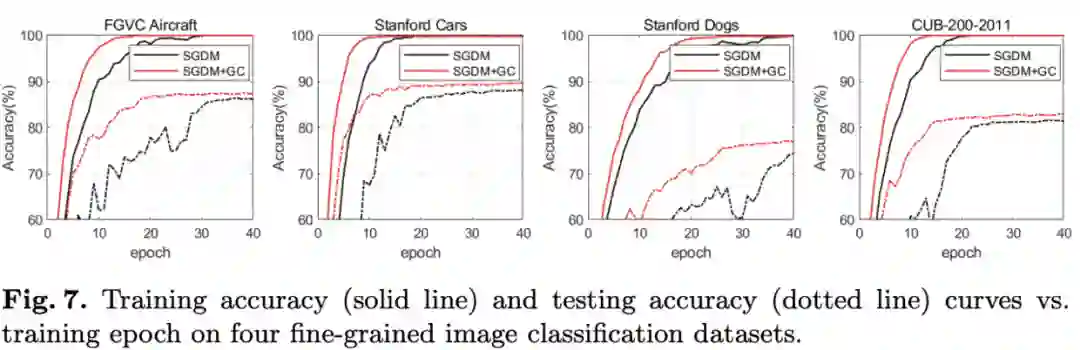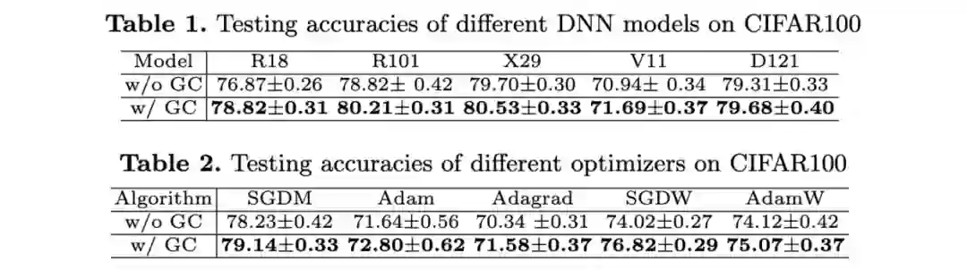 算法1和算法2分别展示了将GC嵌入到SGDM和Adam中,基本上不需要对原优化器算法进行修改,仅需加入一行梯度零均值化计算即可,大约仅需0.6sec。