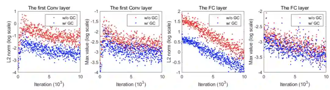 GC的另一个优点是防止梯度爆炸,使得训练更加稳定,作用原理类似于梯度裁剪。过大的梯度会导致损失严重震荡,难以收敛,而梯度裁剪能够抑制大梯度,使得训练更稳定、更快。