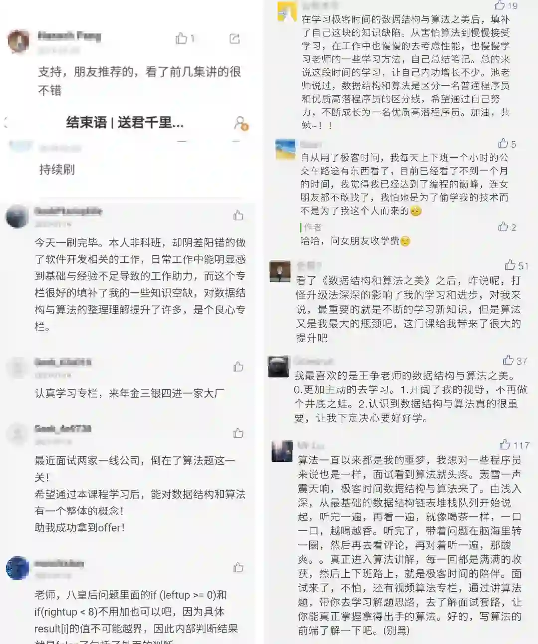 主要串讲一下前面讲到的数据结构和算法,并且结合 Redis、Disruptor 这样的开源项目,剖析它们背后的数据结构和算法,帮你提升读懂源码的能力(JDK 很多源码,不乏大量的数据结构,例如大家喜闻乐见的面试题 HashMap)。这个专栏帮到挺多人的,我随便截了几个,你可以看看: