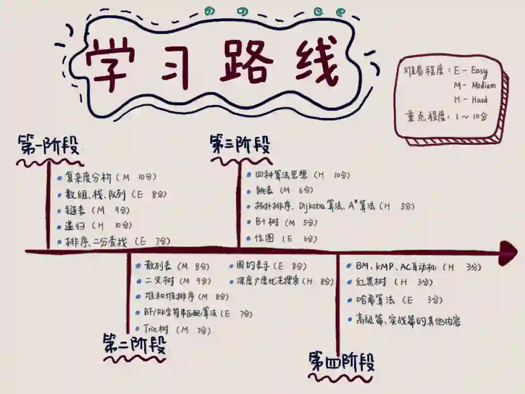 讲算法的人很多,但真正能讲透彻的很少,王争这方面绝对是专家。他把整个学习过程划分成 4 个阶段,列出每个阶段的核心知识,根据难易程度做了拆分,并用 1 - 10 分说明重要性,一张图就能让你有个大概的认知。
