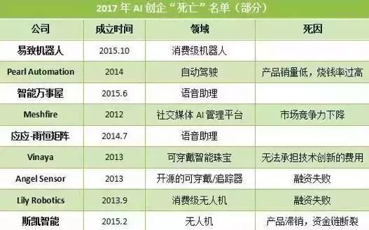 2017年AI创业企业死亡名单(部分)