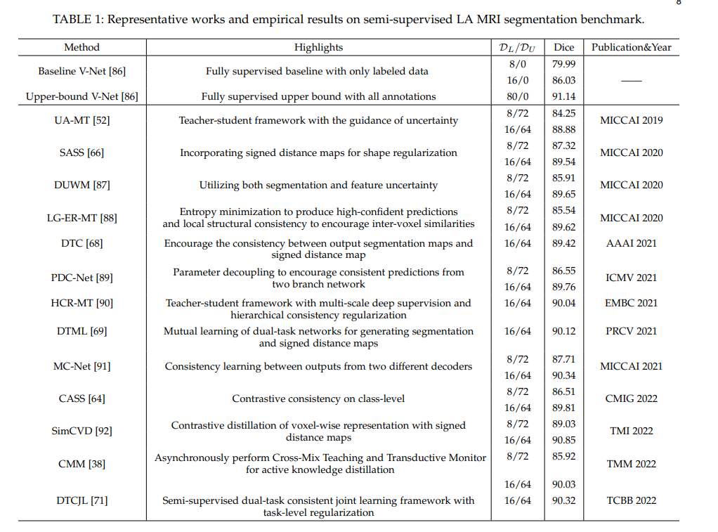 在本文中,我们全面回顾了半监督医学图像分割的最新解决方案,并总结了技术创新和实证结果。此外,我们还分析和讨论了现有方法的局限性和未解决的几个问题。我们希望这篇综述能够启发学术界探索解决这一挑战的方法,并进一步推动医学图像分割领域的发展。