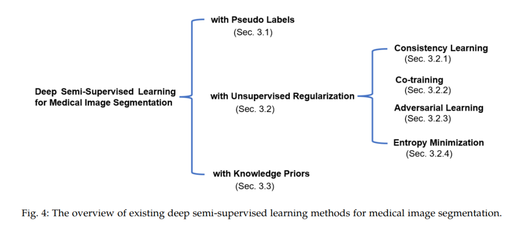 2)无监督正则化的半监督学习,将无标签的图像和有标签的数据联合起来训练一个无监督正则化的分割模型。本节主要包括一致性学习、协同训练、对抗学习、熵最小化。