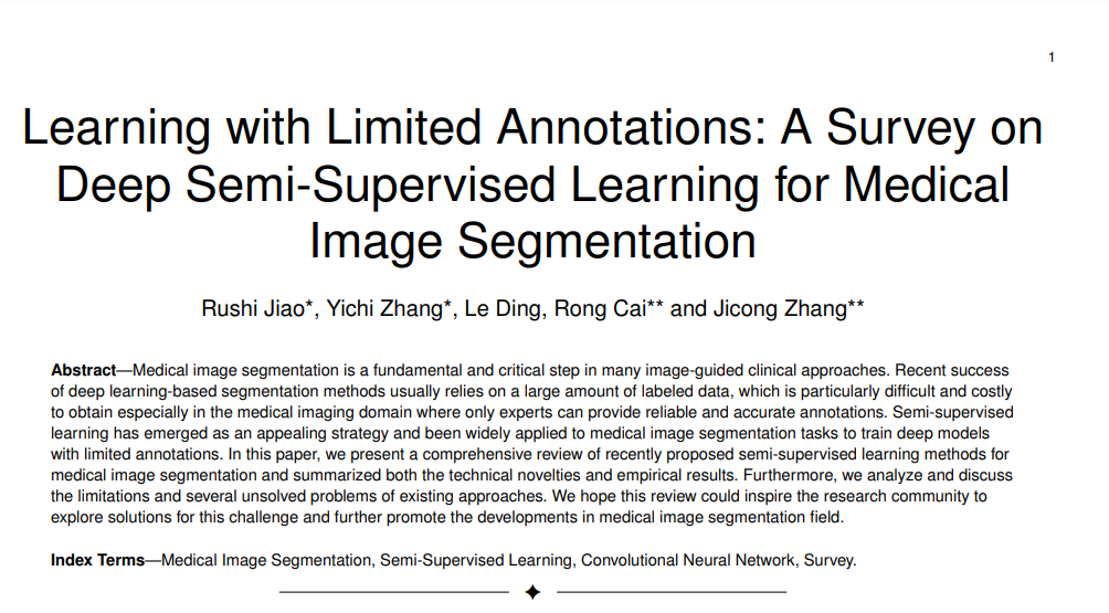 医学图像分割是医学图像处理的基本任务之一,这是计算机辅助诊断、治疗规划、放射治疗[1]、[2]等许多临床方法的基础和重要步骤。最近来自北航的学者发布《深度半监督学习医学图像分割》综述,非常值得关注!