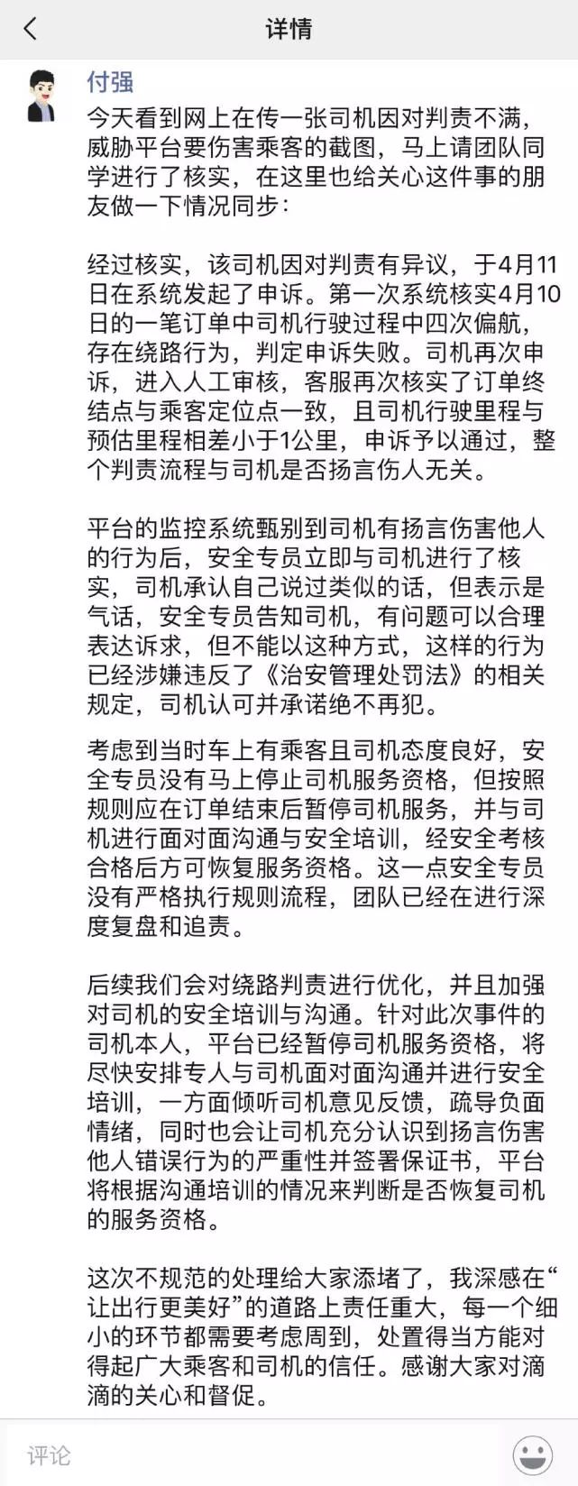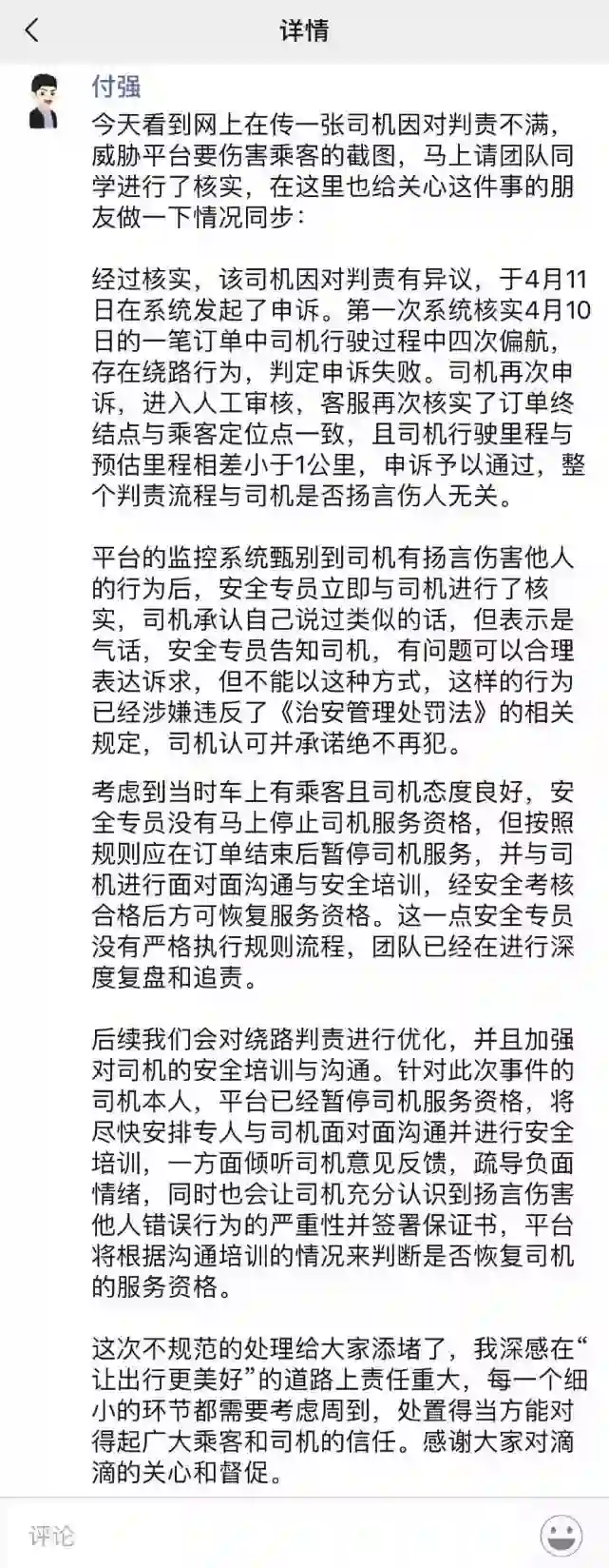 针对网上流传出的滴滴司机申诉失败后再次申诉中使用暴力语言快速获得退款与积分一事,滴滴网约车公司CEO付强在朋友圈回应称,两次核实后确认了申诉予以通过。他表示,该司机在第一次申诉判定失败后再次申诉,进入人工审核,客服再次核实了订单终结点与乘客定位点一致,且司机行驶里程与预估里程相差小于1公里,申诉予以通过,整个判责流程与司机是否扬言伤人无关。(腾讯一线)