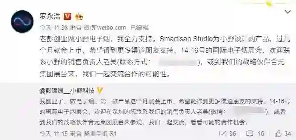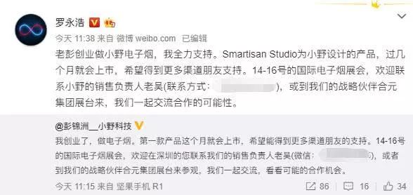4月12日消息,罗永浩在微博上发声,首次公开了传闻已久的小野电子烟信息,不过不是他做的,而是锤子科技总裁彭锦洲创业的项目,不过他会全力支持的。