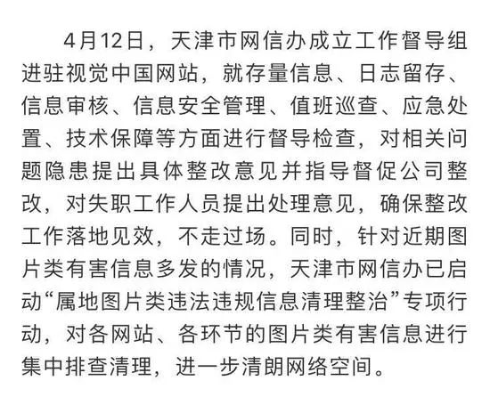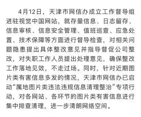 针对视觉中国登载违法违规图片信息的情况,天津市网信办成立工作督导组进驻视觉中国网站,就存量信息、日志留存、信息审核、信息安全管理等方面进行督导检查,对失职工作人员提出处理意见,确保整改工作落地见效,不走过场。