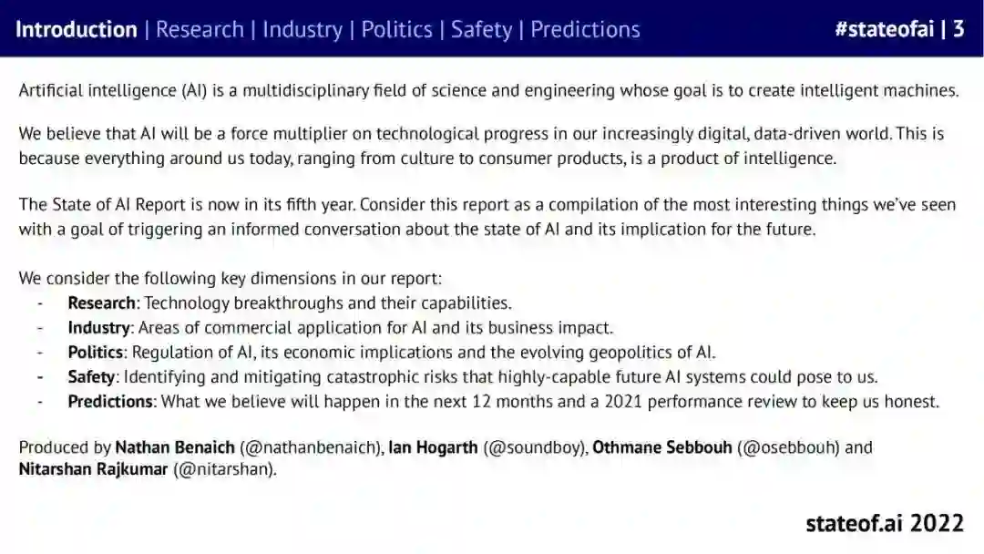 作为每年发布的AI报告,作者从研究、产业、政策、安全、预测五个维度对最新人工智能发展现状和未来预期进行了深入分析和说明。