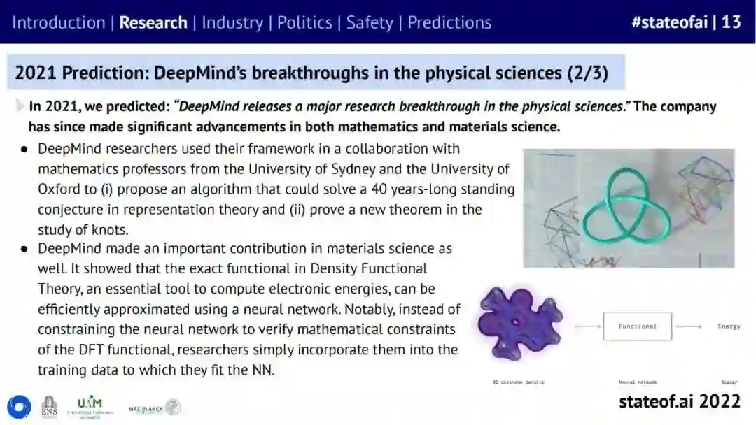 实现的预期中,包括取代RNNs的Transformers,在游戏中超过了人类的表现,取得这一成绩主要因为DeepMind的Gato模型可以预测未来的状态和行动。日内瓦大学的IRIS则解决了在Atari环境中设定的任务。此外,DeepMind在物理科学的研究上也有重大突破。
