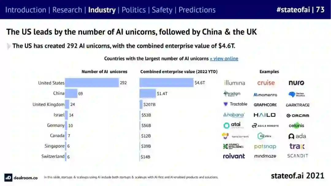 国家间的横向对比上,美国的人工智能独角兽数量领先,其次是中国和英国。截至目前,美国有292家人工智能独角兽企业,价值合计达4.6万亿美元。中国有69家,总估值1.4万亿。