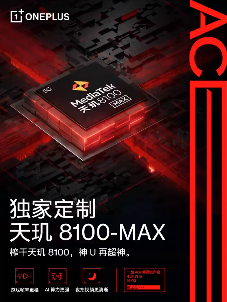 一加中国区总裁李杰今日宣布,一加 Ace 将首发搭载深度定制的天玑 8100-MAX 芯片。天玑 8100-MAX 由一加联合联发科深度定制、深度调校的,在完全拥有天玑8100“神 U”所有特性的基础上,在游戏帧率稳定性、AI 算力、夜景视频降噪能力上进一步大幅提升。据悉,天玑 8100 采用台积电 5nm 制程工艺,由 4 颗主频为 2.85GHz 的 Cortex-A78 大核、4 颗 2.0GHz 主频的 Cortex-A55 组成,安兔兔综合成绩突破 80 万分。
