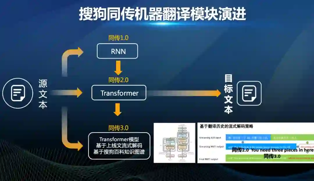 在 3.0 版的系统中,除了 Transformer,还采用了基于上下文的流式解码,并引入了基于搜狗百科的知识图谱。