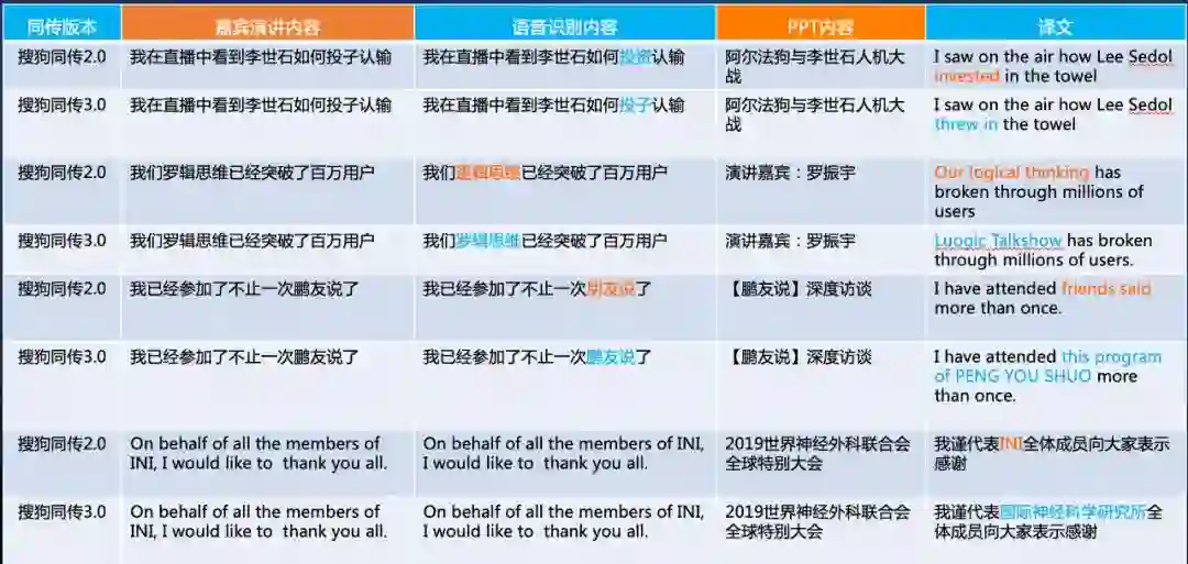 下图展示了一些 3.0 版同传的应用效果,第二列是嘉宾演讲的原始内容,第三列是旧版语音识别出来的内容。