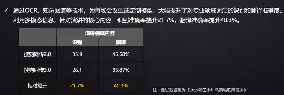 搜狗表示,通过多模态方式获取信息,同时引入知识图谱的情况下,搜狗同传 3.0 针对 PPT 内容的识别准确率提升了 21.7%,翻译正确率提升了 40.3%。