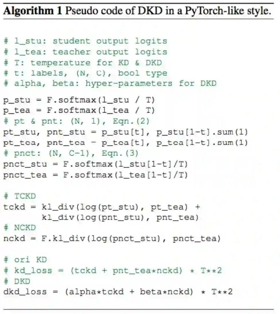 和 KD Loss 相比, 该研究将限制 NCKD 的权重 替换为了 , 并给 TCKD 设置了一个权重 。DKD 可以很好地解决刚才提到的两个问题:一方面, TCKD 和 NCKD 被解耦, 它们各自的重 要性可以独立调节; 另一方面, 对于蒸馏更重要的 NCKD 也不会再被 Teacher 产生的高置信度抑 制, 大大提高了蒸馏的灵活性和有效性。DKD 的伪代码如下:
