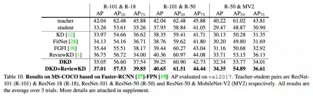 该研究也在目标检测任务(MS-COCO)上验证了 DKD 的性能。如表 10 所示,在 Detector 蒸馏中,DKD 的结果虽不如特征蒸馏的 SOTA 性能,但是依然稳定地超过了 KD 的性能。而将 DKD 和特征蒸馏方法组合起来,也可以进一步提高 SOTA 结果。