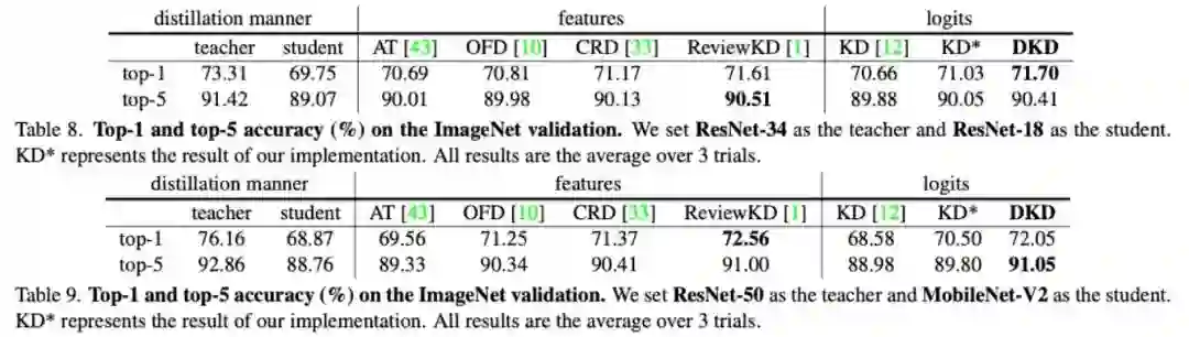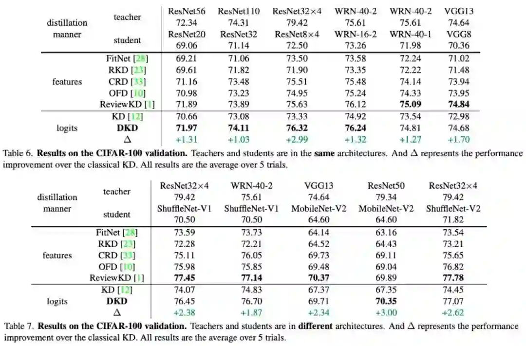 表 6~9 中提供了 DKD 在 CIFAR-100 和 ImageNet-1K 两个分类数据集上的蒸馏效果。和 KD 相比,DKD 在所有数据集和网络结构上都有明显的性能提升。此外,与过去最好的特征蒸馏方法(ReviewKD)相比,DKD 也取得了接近甚至更好的结果。DKD 成功使得 logits 蒸馏方法重新回到了 SOTA 的阵营中。