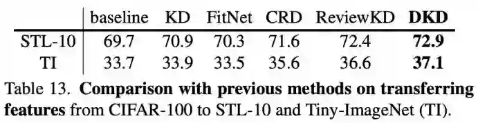 这里该研究尝试将 DKD 训练得到的 student 网络进行特征迁移。如表 13 所示,研究者将在 CIFAR-100 上训练的 student 迁移到了 STL-10 和 TinyImageNet 两个数据集上,在众多的蒸馏方法中,DKD 取得了最好的迁移效果。
