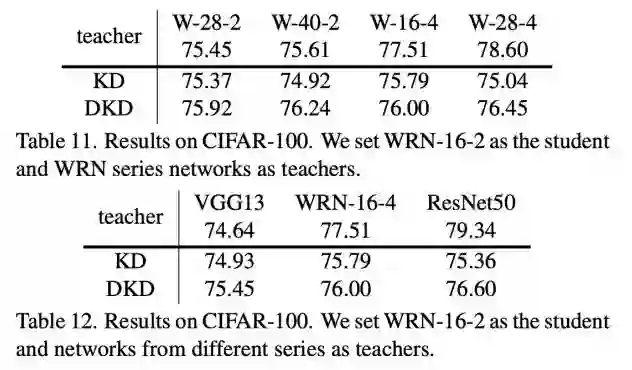 为了证明该观点,研究者也进行了一系列的对比实验。如表 11 和表 12 所示,当使用 DKD 时,大模型蒸馏效果变差的问题被显著改善。该研究希望这一点可以为后续的工作提供一些 insight。