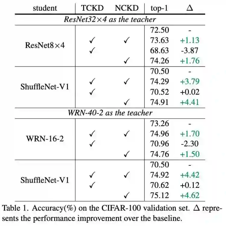 以表 2 中的 ShuffleNet-V1 为例,在使用 AutoAugment 的情况下,训练集难度有了明显提升,此时仅仅使用 NCKD 只能达到 73.8% 的 student 准确率,而同时使用 TCKD 和 NCKD 可以将 student 准确率提升至 75.3%。