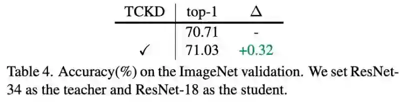 ImageNet 是一个比 CIFAR-100 更困难的数据集,所以该研究在 ImageNet 上也进行了尝试。从表 4 可以看出,在 ImageNet 上只使用 NCKD 的效果也是没有同时使用 TCKD 和 NCKD 要好的。
