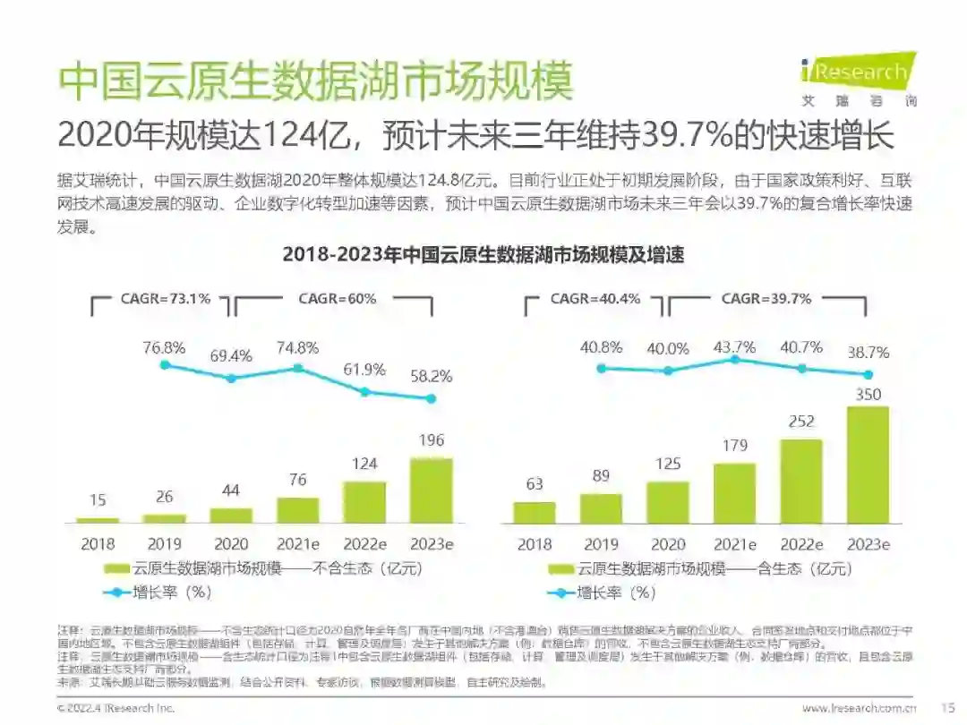 市场现状:2020年云原生数据湖市场规模(含生态)达124亿,预计未来三年将以39.7%的复合增长率快速扩张。