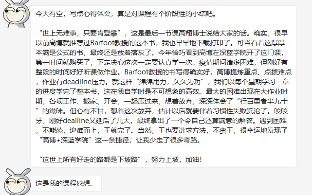 每期班会,助教对作业进行讲评和指导;在班会中,学习更多技巧;在交流中,收获更多思路。