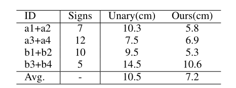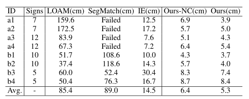 本文的扫描系统包括INS、差分GPS、velodyne HDL-32E,采用线下标定,车辆以40km/h 、60km/h的四度分别在城市道路、高速道路上行驶几个小时。人工放置和测量了多个有代表性的对象(道路标志和地标见下图 )包括常见的道路区域和弱GNSS信号区域,每一对有同样对象用于多事务间的评估。