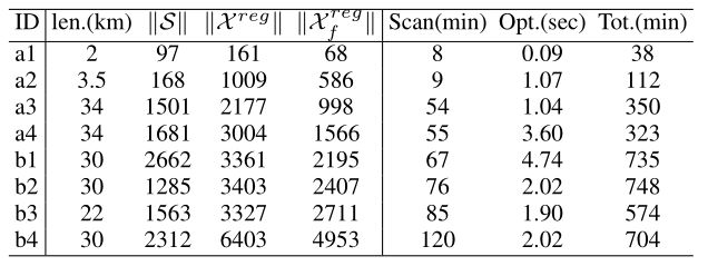 我们在下表中列出了总的长度和每一个事务的构造图的规模,还展示了scanning时间,图优化时间和总的运行时间。