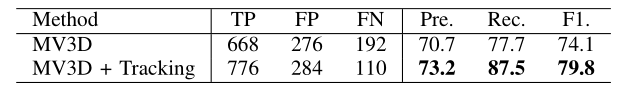 下表展示我们的基于MH-EKF的时空移除的策略的效率。所列出的结果清楚地展示了我们的方法的效率,追踪的策略明显地提高了回调。