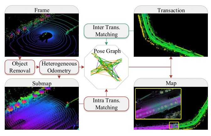 图1 系统的数据流,最后的地图在里程计和点云注册的约束下优化。红色的模块在单个事务情况和多个事务情况中都考虑,绿色的模块则只在多个事务情况中考虑。