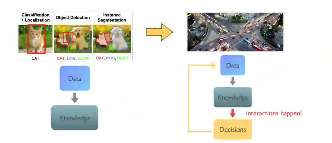 除了从现有数据进行特征识别,现代人工智能应用通常需要计算机程序根据所获得的知识做出决策(见图1)。为了说明决策的关键组成部分,让我们考虑现实世界中控制汽车安全通过十字路口的例子。在每一个时间步,机器人汽车都可以通过转向、加速和制动来移动。目标是安全驶出十字路口并到达目的地(可以选择直走或左转/右转入另一条车道)。因此,除了能够检测对象,如交通信号灯、车道标记,和其他汽车(通过将数据转化为知识),我们的目标是找到一个能控制汽车的方向盘政策做出一系列演习达到目标(决策基于获得的知识)。在这样的决策环境中,还会出现两个额外的挑战: