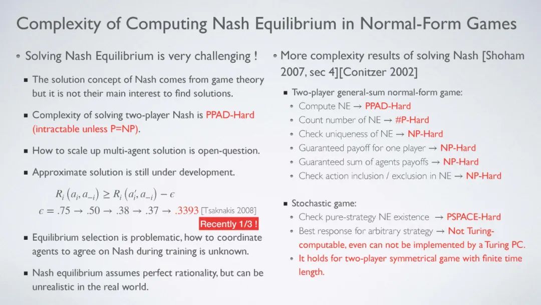 与单agent RL相比,多agent RL是一个更适合现实世界AI应用的通用框架。然而,由于多个agent同时学习的存在,除了单agent RL中已经存在的方法外,MARL方法提出了更多的理论挑战。与通常有两个代理的经典MARL设置相比,解决多代理RL问题更具挑战性。事实上,1 组合复杂性,2 多维学习目标和3 非平稳性问题都导致大多数MARL算法能够解决只有4个参与者的博弈,特别是两方零和博弈。